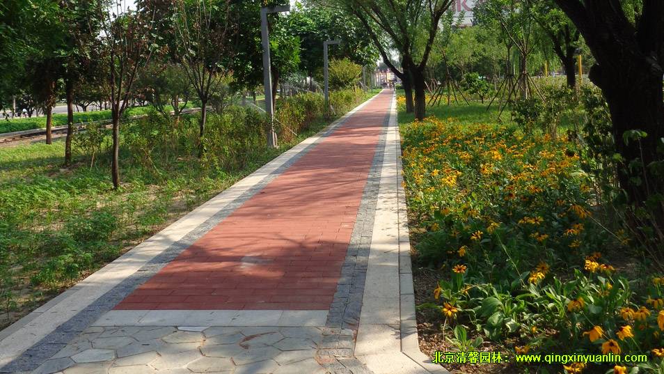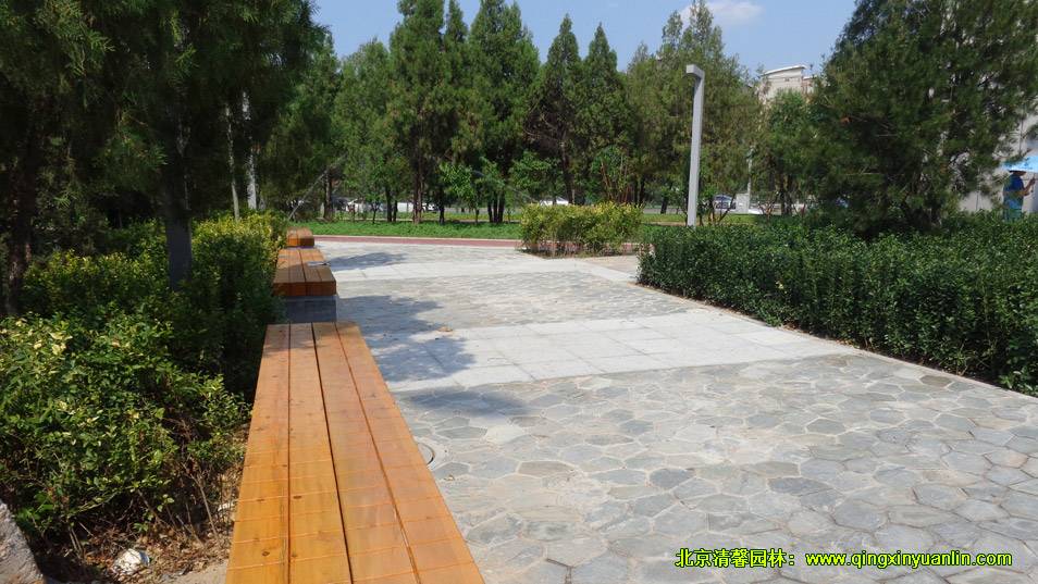 該項目位于北京市海淀區(qū)四季青鎮(zhèn),四季青橋東南側(cè),景觀改造面積23230 m2。施工內(nèi)容為:各出入口、園路、休憩廣場、木棧道、木平臺、自行車停車場,噴灌照明及綠化種植等。作為城市快速路外側(cè)景觀綠地,規(guī)劃沿道路一側(cè)綠化景觀的同時,更加強調(diào)在繁華、人流密集區(qū)域植物對人們心理和身體的調(diào)節(jié)作用。在人流交匯處,設(shè)計休閑活動木平臺空間,以地形和種植圍合、分隔空間,在休閑活動空間內(nèi)設(shè)置樹池座椅等公共休息設(shè)施,為人們創(chuàng)造相對安靜舒適的停留場所。