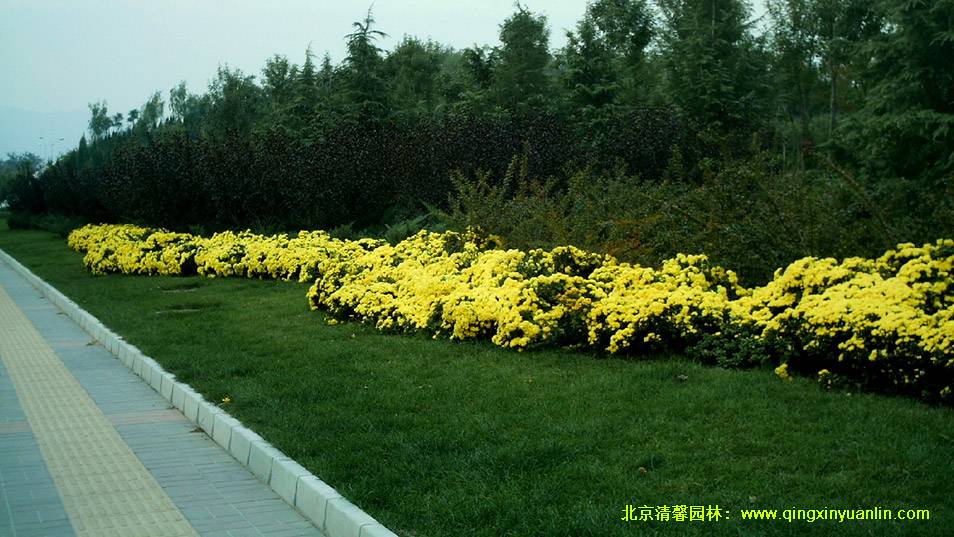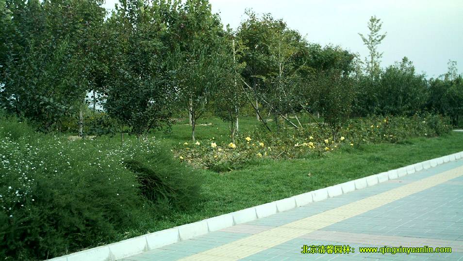 旱河路中間隔離帶以欒樹、檜柏作為骨干樹種,低矮植物采用波浪形色帶種植方式,用大葉黃楊、金葉女貞、紫薇三種不同色彩的植物搭配,突出夏季特點(diǎn),色彩艷麗,造型活潑。道路兩側(cè)30米綠帶內(nèi)主要以北京基調(diào)樹種和骨干樹種為主,并種植了幾十種高中檔喬灌木和彩葉樹種,植物品種豐富,層次鮮明,真正做到四季常綠,三季有花,季季有景可賞。