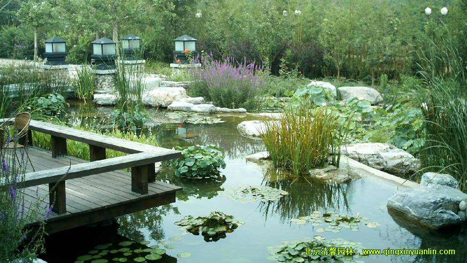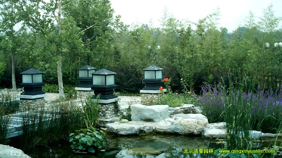 該項目位于北京市海淀區(qū)四季青鎮(zhèn),總面積16000 m2,工程內容:水池、建筑小品、假山駁岸、園路鋪裝、停車場、地形整理、植物種植、給排水、燈光照明等。木屋坐落在起伏的綠地中,屋邊水系蜿蜒,水流潺潺,不管是沿著屋邊木棧道漫步,還是坐在水邊木亭內品茗,都可領略到周邊精心營造的美景,讓人有一種置身山清水秀的自然美景中的舒暢感覺。
