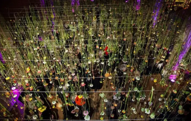 麗貝卡·路易斯法律事務(wù)所以他的獨特的設(shè)施引人注目,包括成千上萬的懸掛在頭頂掛著花。去年2月,她被倫敦的花園博物館委托創(chuàng)建一個臨時的工作場所,耗費巨資為他們的花卉栽培辦展覽。3500五彩繽紛的玫瑰被掛在銅線上,成為懸浮在歷史建筑的一部分。游客們被邀請在空靈的樹冠下散步。