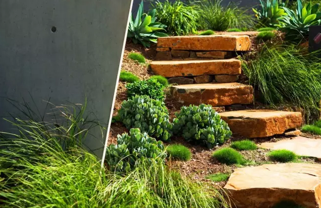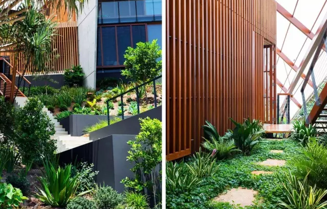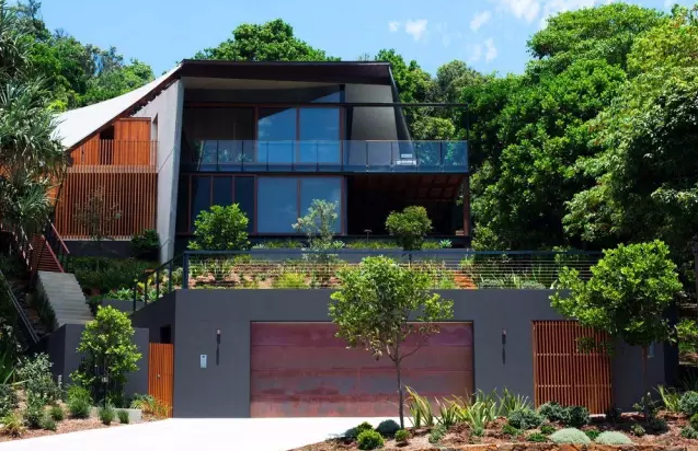 飛翼住宅景觀項目住宅位于Wategos Byron海灣后面的一座小山丘上,該住宅地理位置優(yōu)越,有一種居高臨下的氣勢。居民在住宅里便可以俯瞰整個Julian礁石區(qū)的美景。場地中坡道很陡,房屋就坐落在一條街區(qū)的后方,為了使住宅入口處得以美化,該設計團隊在入口區(qū)建立了一個花園,這樣布局后,住宅房屋就與場地中的各個景觀聯(lián)系起來了,并且可以從住宅直接望向海邊,加深了視覺感受。花園的結構設計很有特點,設計團隊特意選用了當?shù)氐奶烊徊牧蟻斫ㄔ欤耘嗟闹参锓N類與周邊自然環(huán)境的結合力非常強,而且保養(yǎng)費用低,非常經(jīng)濟。