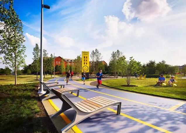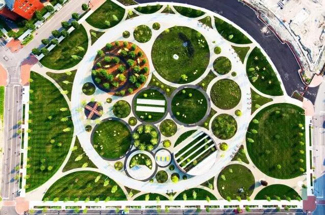 費(fèi)城海軍造船廠中心5英畝的綠色空間是由James Corner Field Operations設(shè)計(jì)的。這里曾經(jīng)是一個(gè)封閉的軍事設(shè)施場地,如今卻成為該地區(qū)最先進(jìn)、最充滿活力的商業(yè)地點(diǎn)和中心公園。設(shè)計(jì)結(jié)合場地的原始生境和尖端城市潛力,打造出一個(gè)新型的可持續(xù)、綠色、自然、活躍和城市化的環(huán)境。該公園的設(shè)計(jì)特色是運(yùn)用了一連串綠色的圓形,這樣的圓形設(shè)計(jì)來自于大自然。圓形的公園看似是一個(gè)整體,實(shí)際上擁有多個(gè)獨(dú)立的空間。這里有許多創(chuàng)意空間,包括健身站、露天劇場“陽光草坪”、吊床林、球場、乒乓球桌、公共工作臺(tái)、雨水收集裝置等。場地將活躍的娛樂游戲與安靜的聚會(huì)場所實(shí)現(xiàn)了很好的平衡。例如,X型的長桌用于野餐和會(huì)議,附近黃色的吊床和樹木則形成安靜的休息空間。